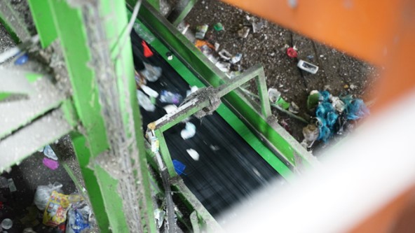 첫 번째 선별 단계에서는 회전식 드럼 스크린이 포장재를 크기별로 분리합니다. 마지막 3×3cm 크기의 스크린을 통과하는 물질은 추가 선별 없이 열적 재활용(소각) 공정으로 보내집니다.